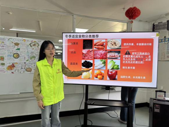 志愿者不仅送上慰问品、陪伴老人拉家常、清扫整理环境,还围绕立冬节气展开特色活动:讲解“补冬”“吃饺子”等传统习俗,加深老幼对节气文化的了解;结合专业优势,为老人提供膳食养生指导,推荐适合冬季的营养食谱;同时搭建代际沟通平台,促进老少互动交流。
