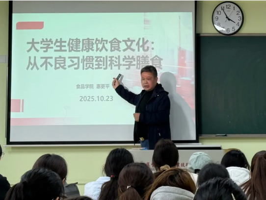 为响应工会活动号召,提升学生健康素养,10月25日14时,食品学院在教学楼B303教室成功举办“大学生健康饮食文化:从不良习惯到科学膳食”专题讲座。活动特邀学院离退休教师惠更平教授担任主讲,吸引百余名学生积极参与。
