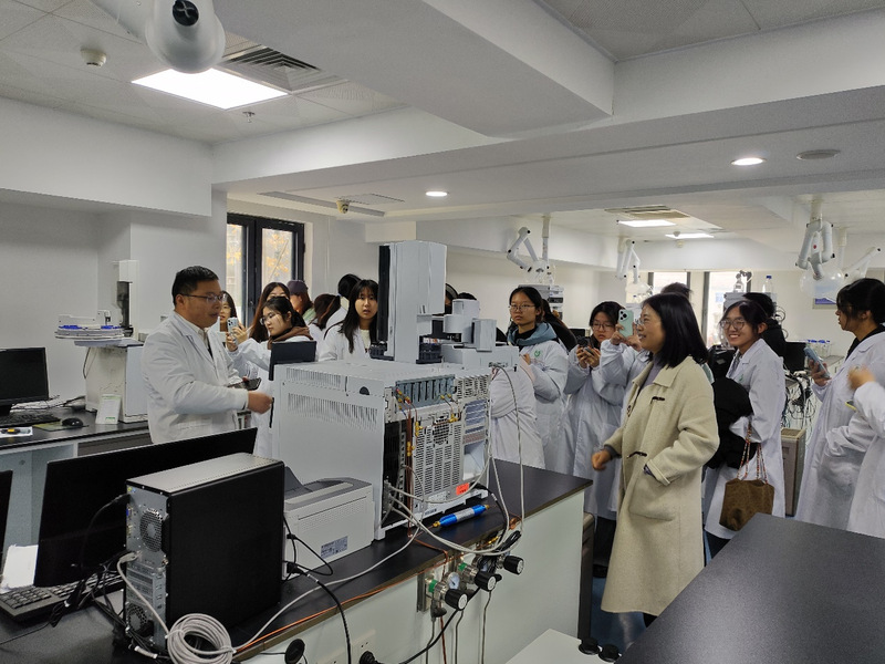 随后,在魏云计老师的引导下,师生依次参观了检测中心的多个核心检测区域。魏老师介绍了包括凯氏定氮仪、高效液相色谱仪、气相色谱-质谱联用仪在内的多类型仪器,并详细讲解各类检验设备的原理、用途及操作流程。魏云计老师现场运行了部分设备,让学生在实际工作场景中体验到检测技术的巨大魅力。