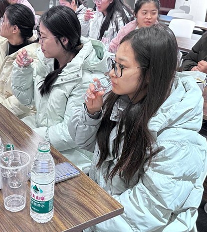 在实践环节,培训重点讲解了白酒感官品评的基本步骤与科学方法,引导同学们学习如何通过视觉、嗅觉、味觉进行专业品鉴。活动现场还设置了白酒品评体验区,同学们在指导下对不同香型酒样进行对比品鉴,亲身感受中国白酒的风味层次与艺术魅力。