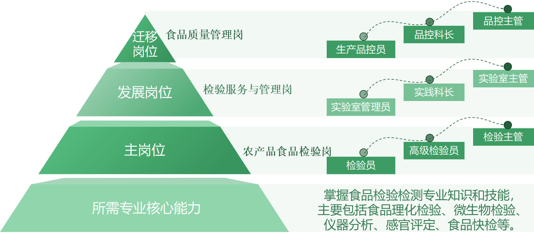 【职业发展】本专业的主岗位为食品检验岗,其职业发展路径为农产品食品检验员→高级检验员→检验主管;发展岗位为检验服务与管理岗,其职业发展路径为实验室管理员→实践科长→实验室主管;迁移岗位为食品质量管理岗,其职业发展路径为生产品控员→品控科长→品控主管。