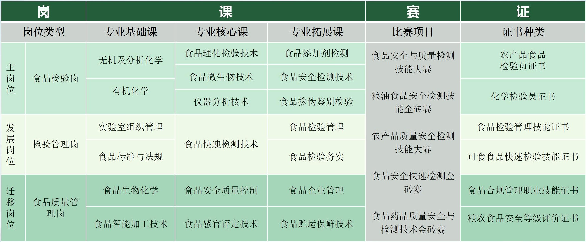 【培养目标】食品检验检测技术专业(专业代码490104)培养能够践行社会主义核心价值观,传承技能文明,德智体美劳全面发展,具有一定的科学文化水平,良好的人文素养、科学素养、数字素养、职业道德、创新意识,爱岗敬业的职业精神和精益求精的工匠精神,较强的就业创业能力和可持续发展的能力,掌握本专业知识和技术技能,具备职业综合素质和行动能力,面向食品制造、农副食品加工、质检技术服务行业的农产品食品检验员、食品质量品控员、产品质量检验工程技术人员、质量认证认可工程技术人员等职业,能够从事食品检验检测、食品安全管理与质量控制、实验室管理与服务等工作的高技能人才。
